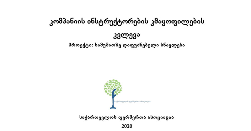 ანალიტიკა პანდემიის გავლენა სამუშაოზე დაფუძნებული სწავლების პროცესზე პროფესიულ საგანმანათლებლო დაწესებულებებსა და სასწავლო საწარმოებში • June 19, 2024 • ანალიტიკა Covid 19-ის გავლენა ფერმერებსა და სოფლის მეურნეობაზე • June 19, 2024 • ანალიტიკა 2018-2019 წლების კურსდამთავრებულთა კვლევის ანგარიში (Tracer Study) • June 19, 2024 • ანალიტიკა პროფესიული სასწავლებლით სტუდენტების კმაყოფილების კმაყოფილების კვლევა • June 19, 2024 • ანალიტიკა კომპანიის ინსტრუქტორების კმაყოფილების კვლევა • June 19, 2024 • ანალიტიკა 2020 წლის კურსდამთავრებულთა კვლევის ანგარიში (Tracer Study) • June 19, 2024 • ანალიტიკა 2021 წლის კურსდამთავრებულთა კვლევის ანგარიში (Tracer Study) • June 19, 2024 • ანალიტიკა აგრარულ სექტორში სამუშაოზე დაფუძნებულ სწავლებაში ჩართული აგრობიზნესების ხარჯთსარგებლიანობის ანალიზი • December 28, 2023 • ანალიტიკა